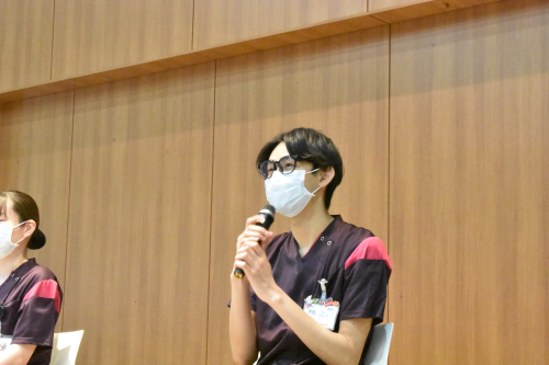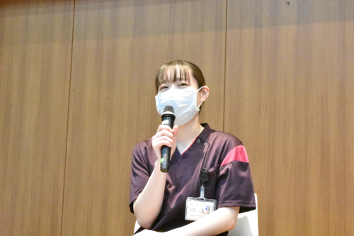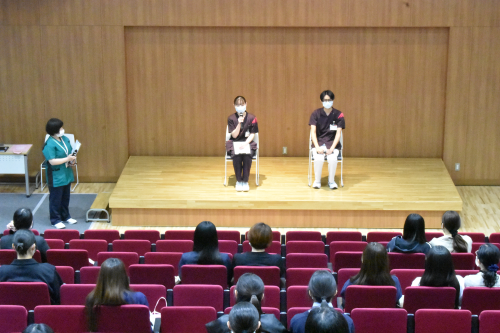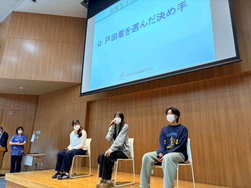 最前線で勤務している2人の先輩看護師(グループ病院勤務4年目と2年目)と、先輩方を目標にがんばっている在校生のお話は、